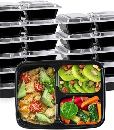 39 oz. 3 Compartment Black Rectangular Plastic Take-Out Container w/ Clear Lid – 150 sets Microwave/Dishwasher/Freezer Safe