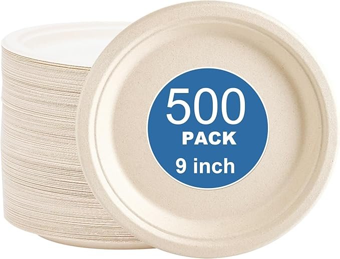 500-Count 9 Inch Compostable Paper Plates, Heavy-Duty Bagasse Disposable Plates, White Sugarcane Plates, PFAS-Free, Ideal for Salads, Sandwiches, Light Entrees & Family Parties