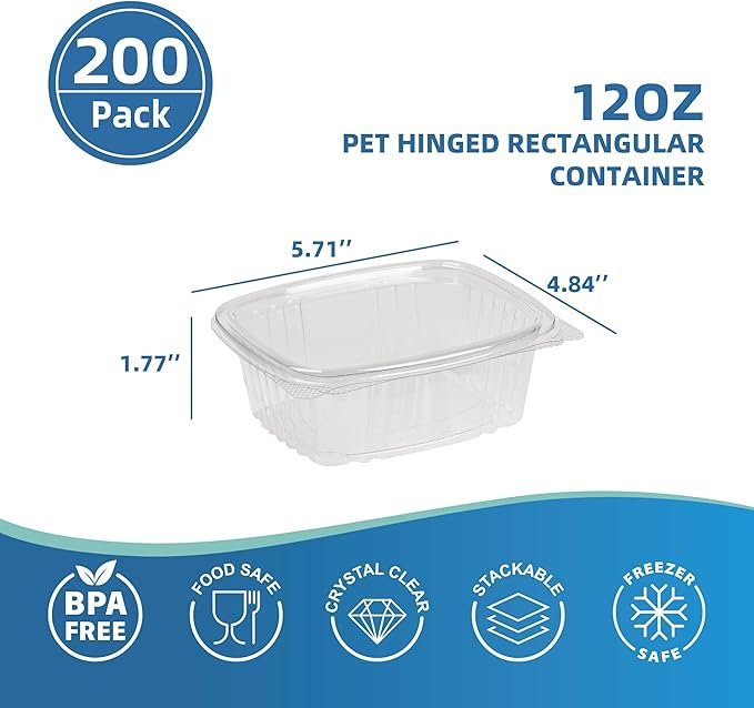 200 Count12 oz Clear PET Plastic Hinged-Lid Deli Container